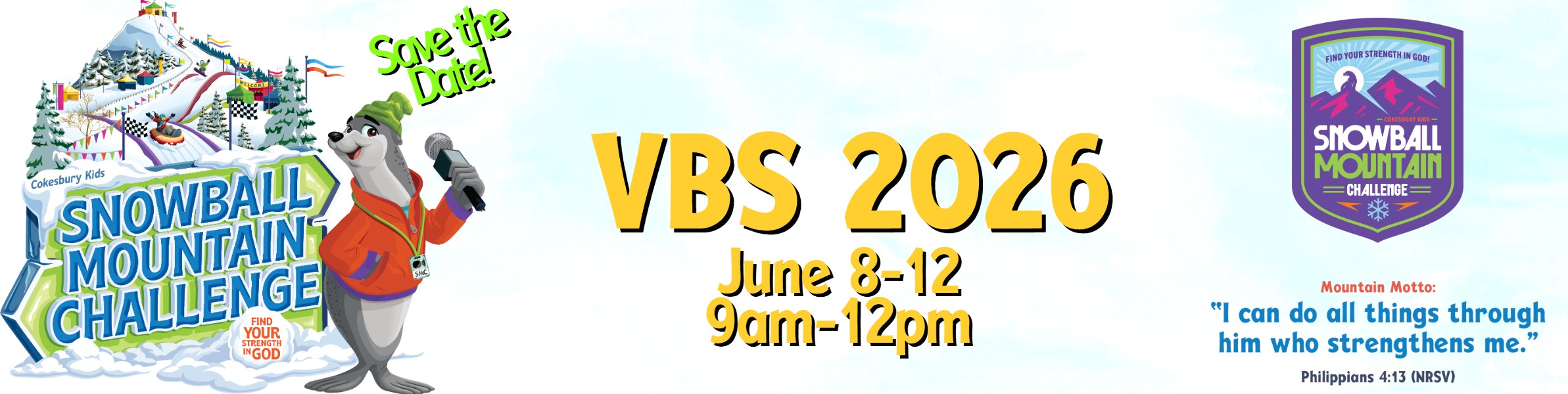 Vacation Bible School (VBS) occurs every summer for preschool through 5th grade with volunteer opportunites for grades 6–12.